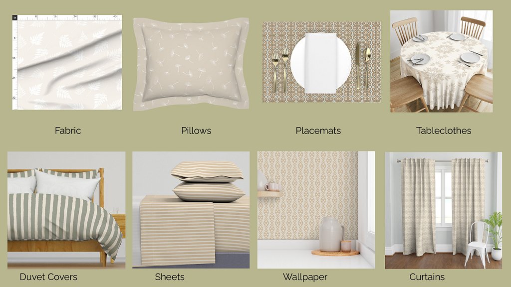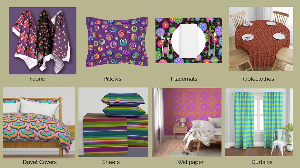 You'll find so much more in my Spoonflower Store. Spoonflower offers my designs on fabrics (over 25 kinds), wallpaper (7 kinds), and home goods such as duvet covers, sheets, pillows, table runners, tablecloths, placemats, napkins, tea towels and curtains. With more than 1250 of my designs on Spoonfflower, you’ll be able to create a special one-of-a kind treasure.