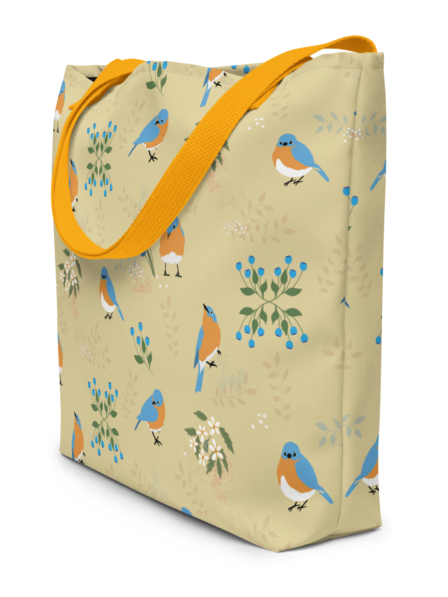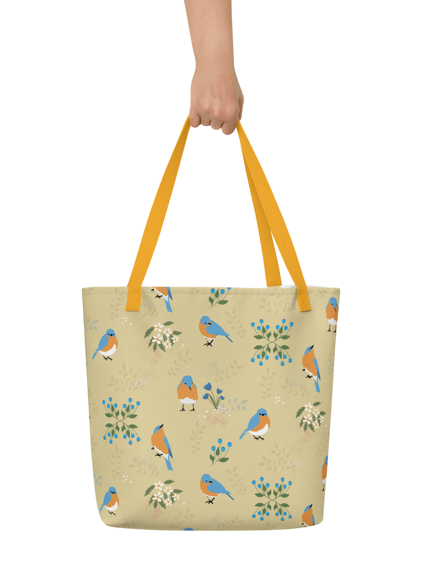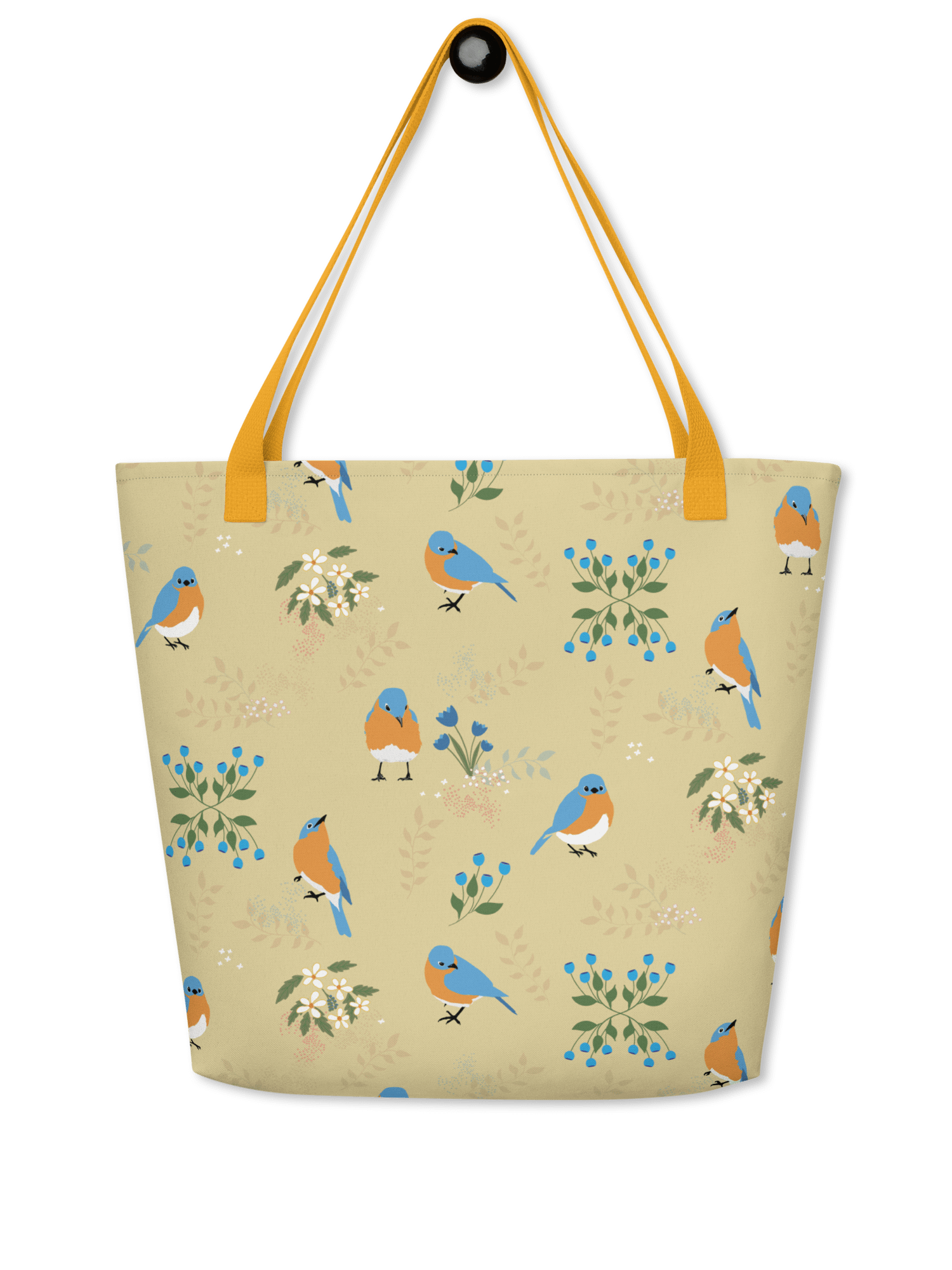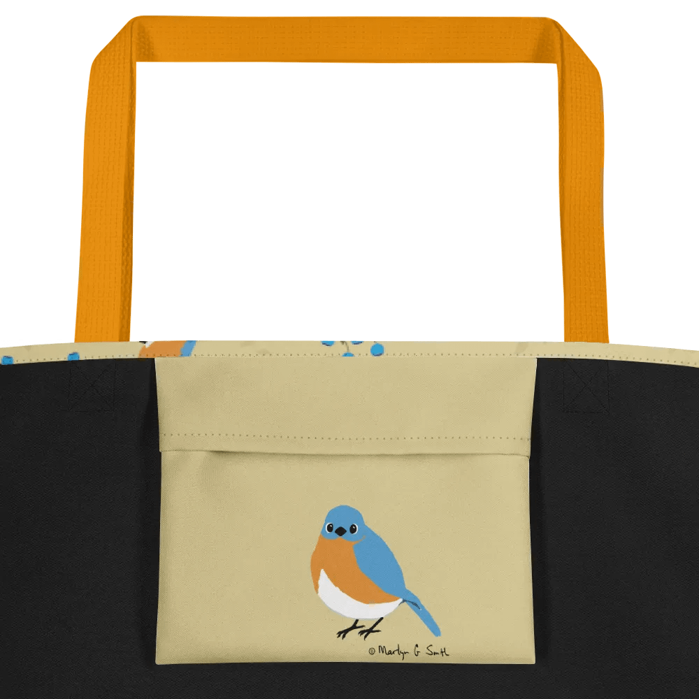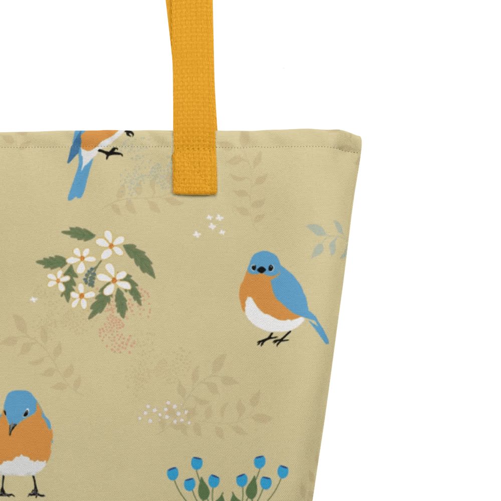 Bluebirds and Flowers, the best of both worlds. This large tote has a roomy 16" x 20".  It has an inside pocket for your keys or phone or smaller items that you don't want falling to the bottom of the bag. Plenty of room in this one, with a 4-gallon capacity.