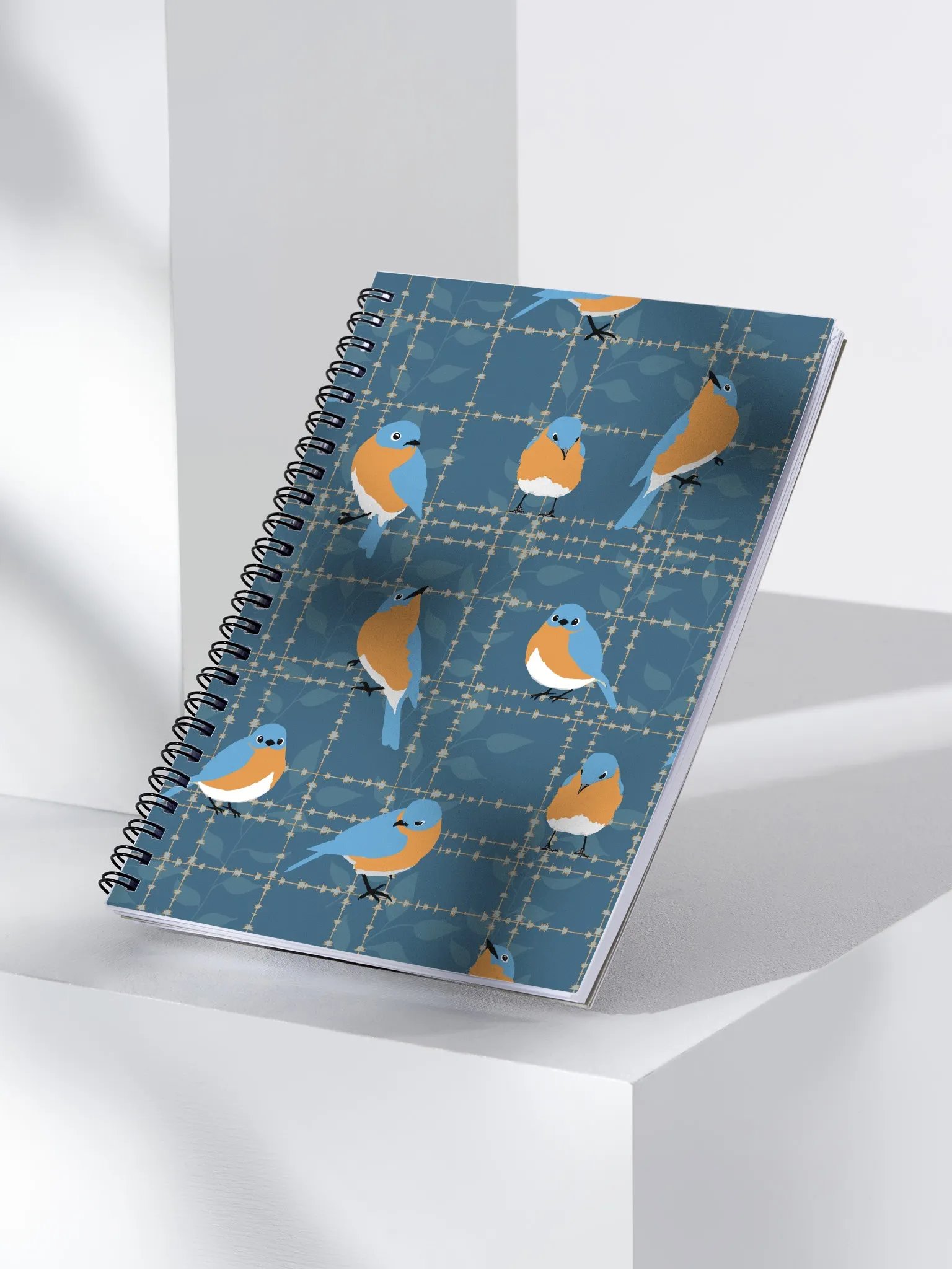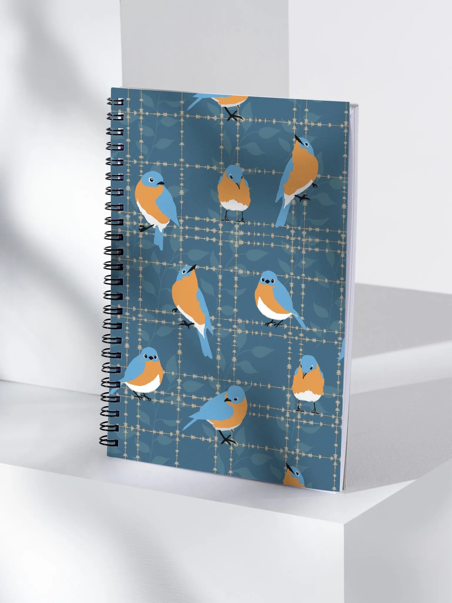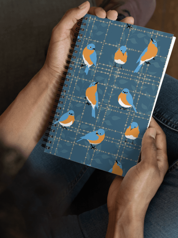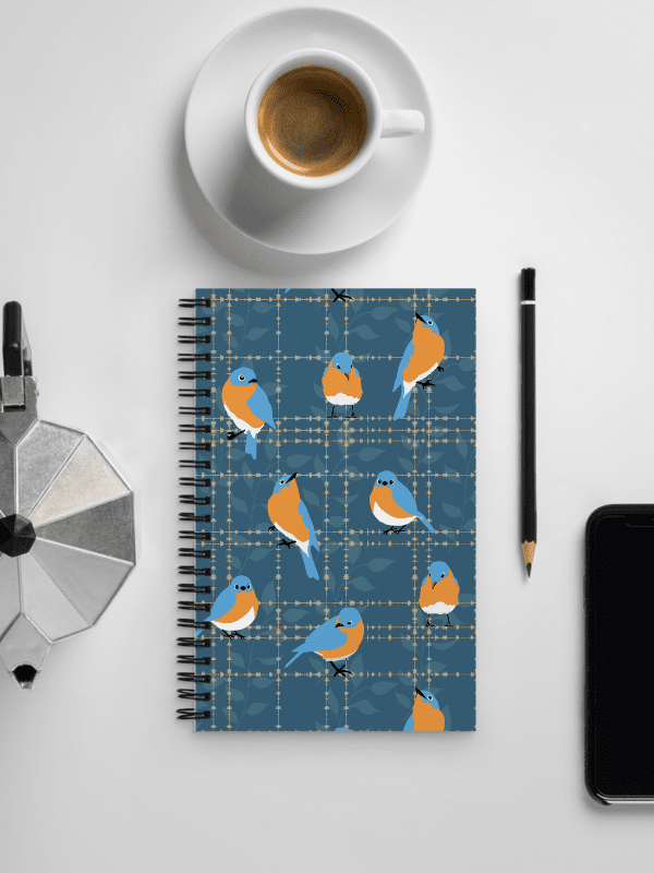 This dot grid, spiral notebook is designed with two of my bluebird patterns.  On the front is "Bluebird Song."  Here, Eastern Bluebirds are perched on a plaid created from an oscillogram of a singing Eastern Bluebird.  On the back is "Pure Song."  Why that name? Yep, because it's the song only.