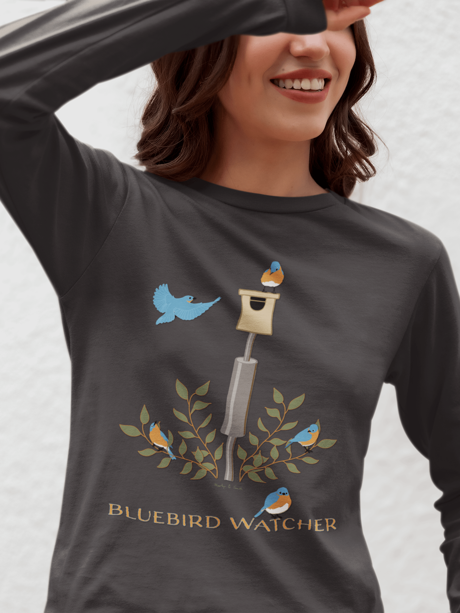 Are you one of the many of us Bluebird fans?  Let this "Bluebird Watcher" long sleeve shirt, with its flashy bluebirds and distinctive Gilwood bluebird box, help you tell the world. It can be a real conversation starter and it's always fun to meet kindred spirits.